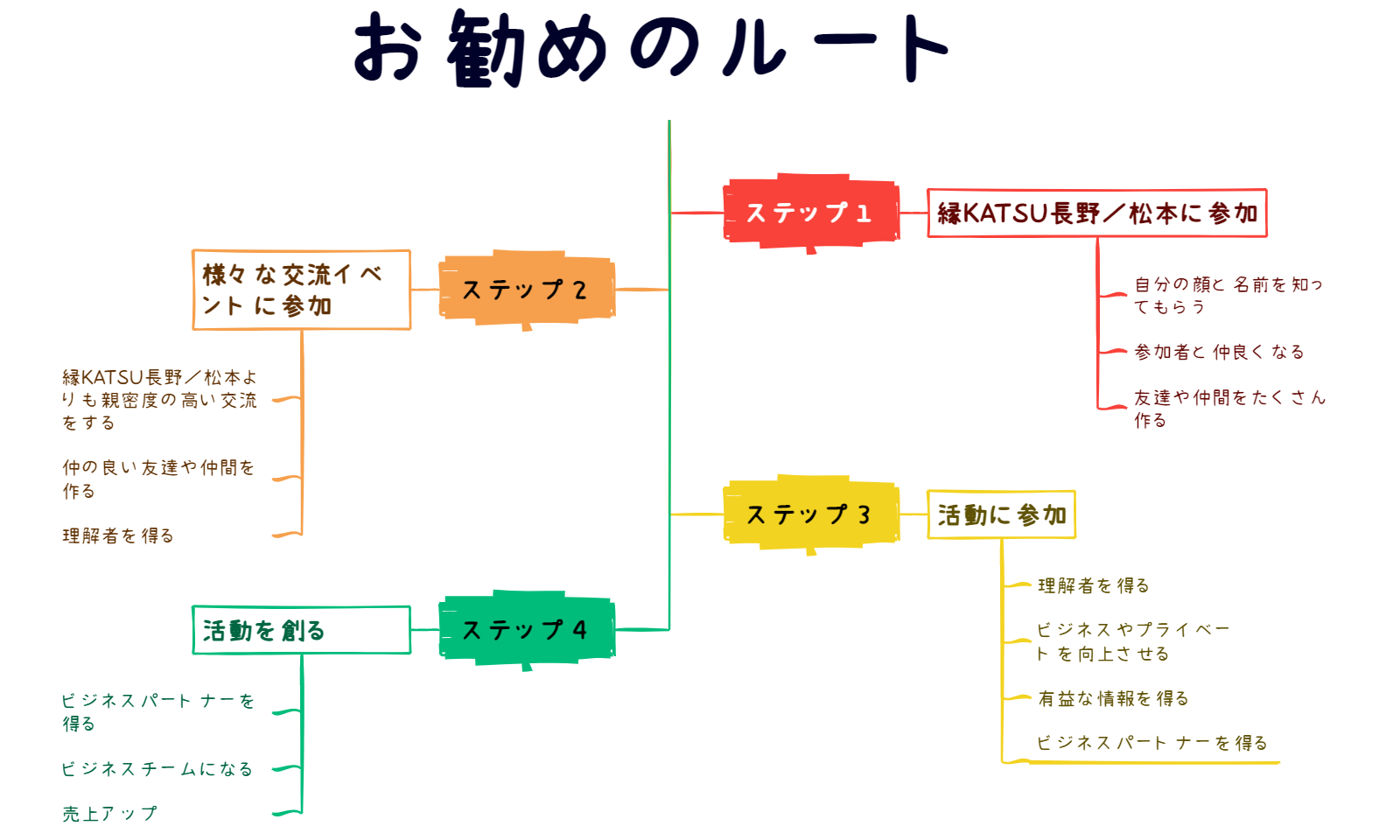 「縁KATSU長野」や「縁KATSU松本」に参加後、その「ご縁をうまく活用するためにどうしたら良いのか?」をわかりやすく図にしました。